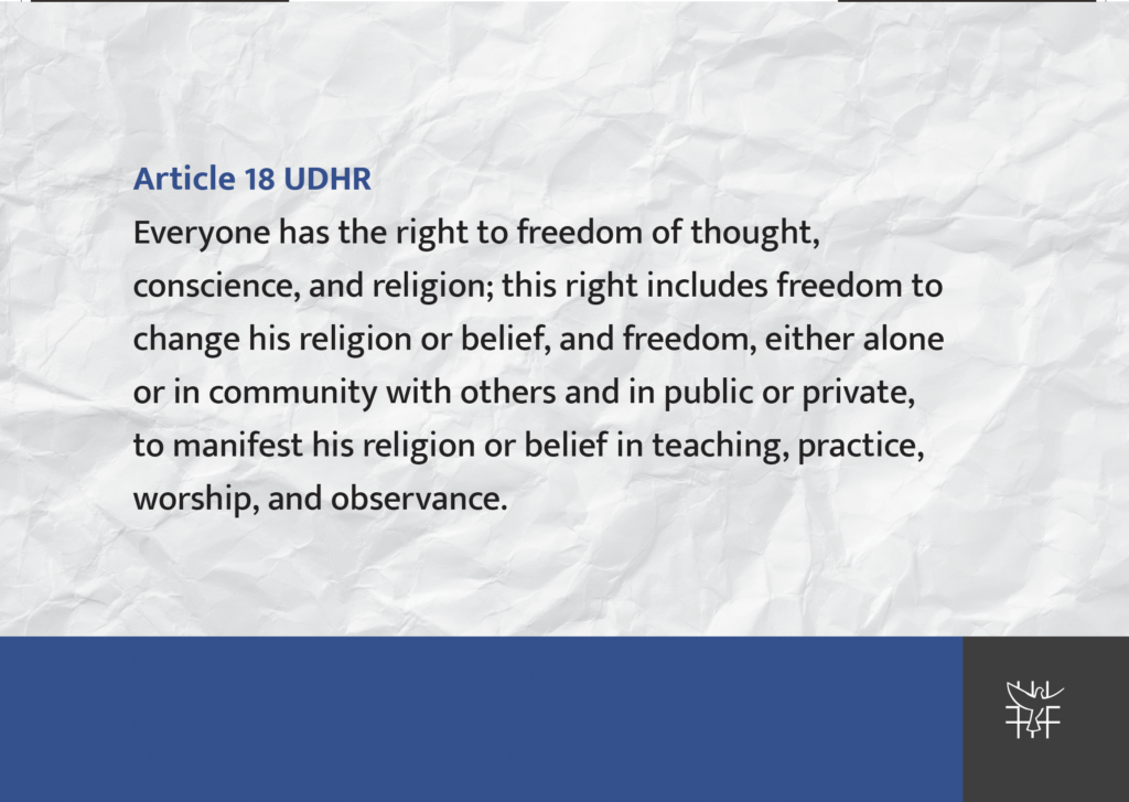 Everyone has the right to freedom of thought, conscience and religion; this right includes freedom to change his religion or belief, and freedom, either alone or in community with others and in public or private, to manifest his religion or belief in teaching, practice, worship and observance.