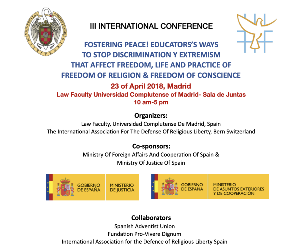 The III Madrid Conference was held at the Faculty of Law of the Universidad Complutense of Madrid the 23 of April 2018. It was promoted and co-organized by the International Association for the Defense of Religious Liberty (AIDLR) and the Law Faculty of the University Complutense of Madrid (UCM), and was co-sponsored by the Ministry of Foreign Affairs and Cooperation and the Ministry of Justice of Kingdom of Spain.